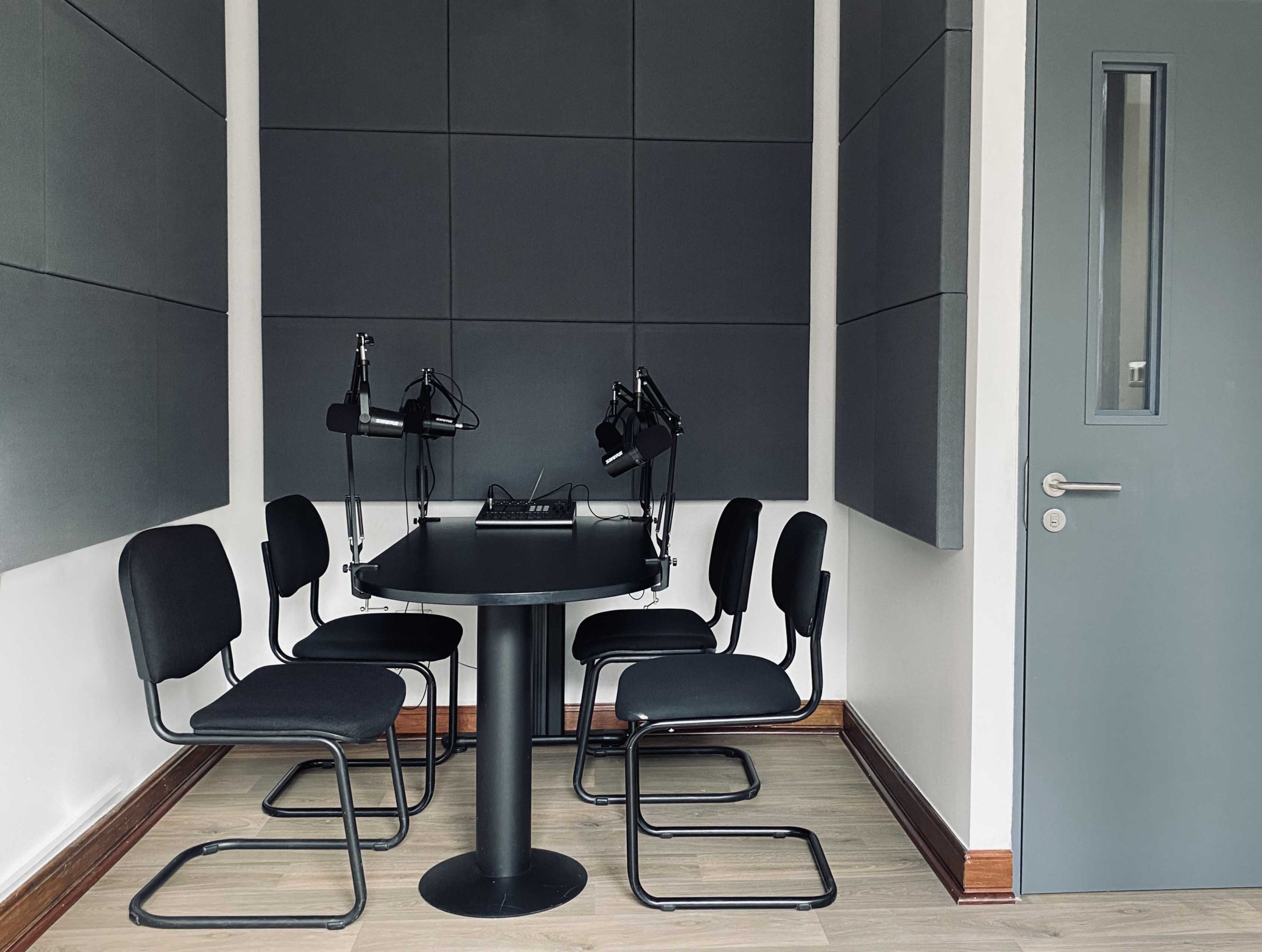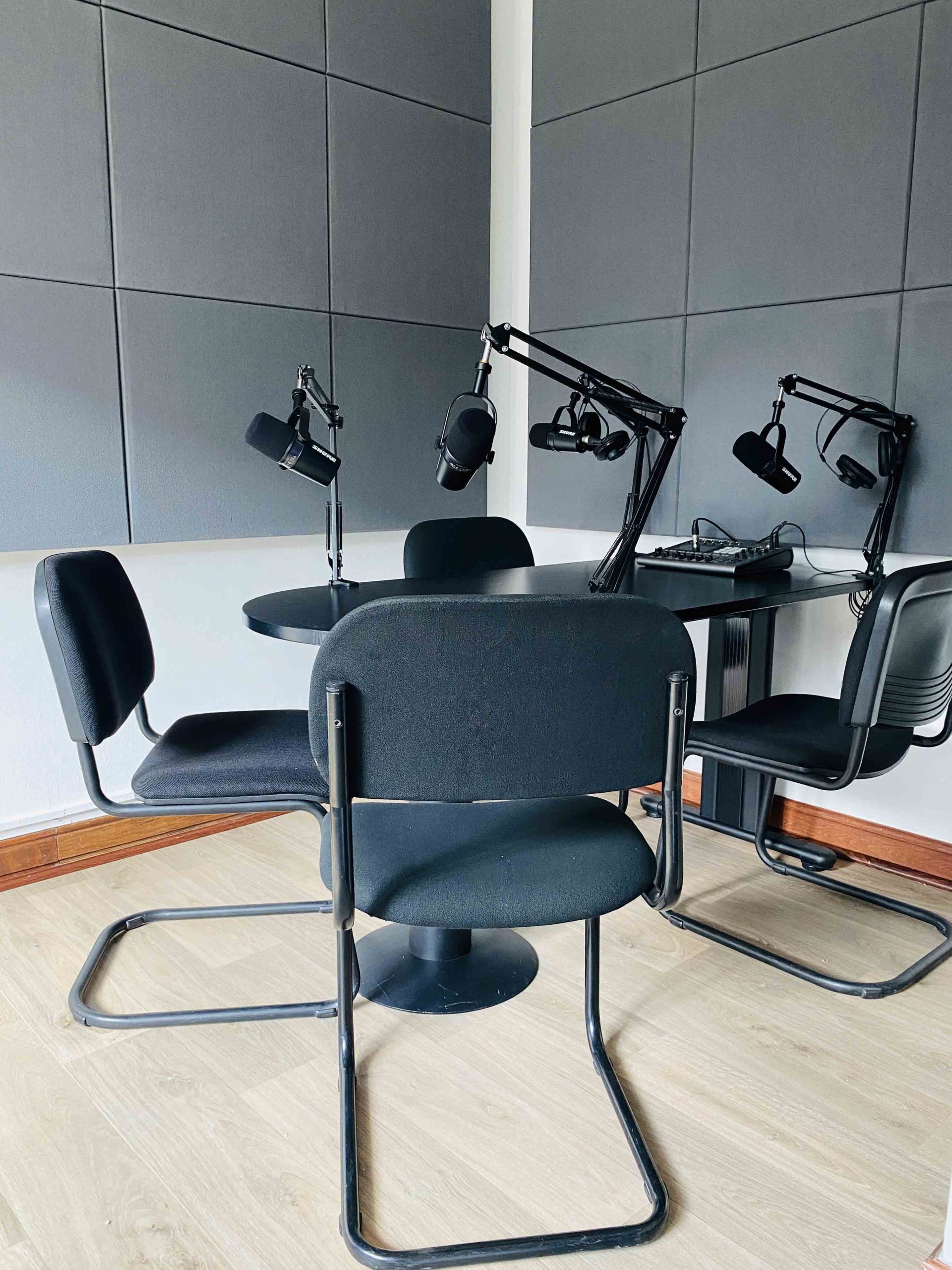Contamos con un nuevo estudio de grabación con tratamiento acústico para la correcta realización de contenidos de audio y audiovisuales en la Dirección de Comunicaciones UC (Av. Libertador Bernardo O´Higgins 340). El espacio incluye: Grabador Zoom PodTrack P8 de 8 canales, “plug and play”. Basta con solamente encender y grabar. No se necesita computador. Se puede grabar una conversación de celular o computador (Entrevistas remotas). 4 Micrófonos Shure. 4 Audífonos). Además ofrecemos asesorías técnicas y de contenidos